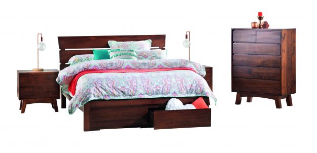 EUREKA Queen Bedroom Suite with under bed storage. There are size options with the Bed available. Tallboy comes as a 9 or 6 drawer. Dresser and Mirror also available.