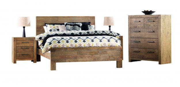 MELROSE Queen Bedroom Suite. King Bed also available. 6 Drawer Dresser with Mirror available to go with the Suite. 5 drawer Tallboy and 3 Drawer Bedside Table all in Recycled Walnut finish.